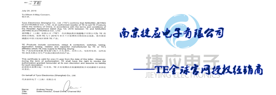 南京捷應電子有限公司是國際無源器件品牌美國泰科電子(TE)在中國華東地區(qū)的主要通路商,代理經(jīng)銷旗下全系列產品包括TYCO(AMP)系列連接器、接插件、OEG、SCHRACK、P&B功率繼電器、美國RACHEM各類航空導線、熱縮套管、模縮套、標識產品、電線電纜。
